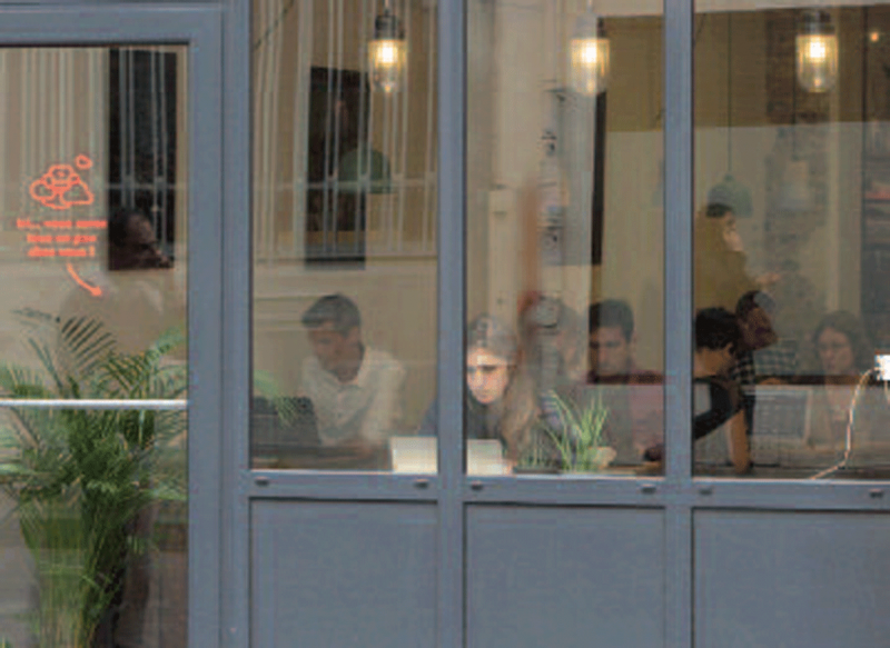 Cela se passe dans un bar parisien. Un espace multifonctions d’aujourd’hui, où l’on va pour prendre un café bien sûr, pour rencontrer quelqu’un, mais aussi beaucoup pour travailler. Certains passent toute la journée devant leur ordinateur, donnent rendez-vous, passent des entretiens, font des réunions de travail. Au point que le responsable du lieu a cru utile de faire installer une photocopieuse. Il y a en même temps une petite exposition. Et un petit récital d’un collectif de poètes. On élabore un petit peu d’art. Un endroit flexible et détendu, en somme, le cadre actuel de la contrainte. Ah oui, parce que cette pièce tournera autour du thème de la liberté et de ses multiples paradoxes. De la liberté dans un pays libre. Ici.